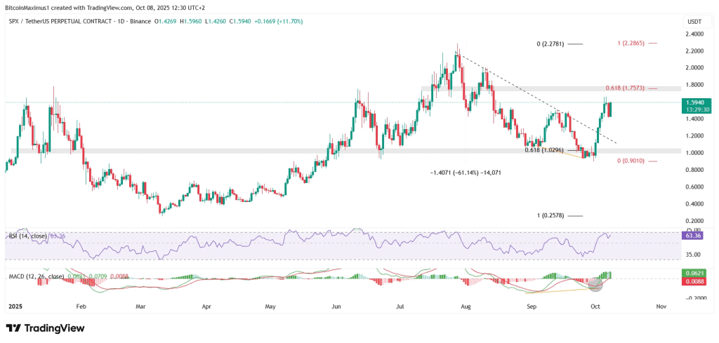 قیمت SPX در حال حاضر حدود ۱.۶۲ دلار است و بالاتر از سطح حمایتی کلیدی ۱.۵۸ دلار باقی مانده است. این آلت کوین طی هفته گذشته حدود ۶۲ درصد رشد داشته و به بالاترین سطح خود در دو ماه اخیر رسیده است؛ این اتفاق نشانهای از بازگشت توجه سرمایهگذاران است.