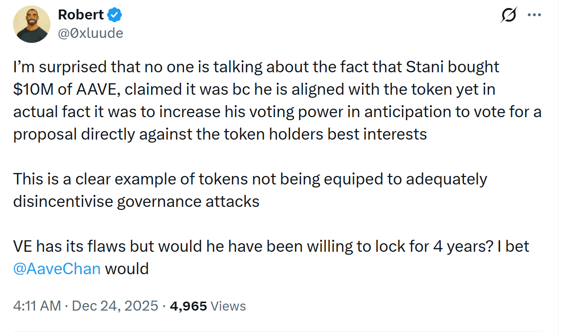 ساموئل مککالک از USD.ai نیز به تمرکز قدرت رأیدهی اشاره کرد و در پستی در X رأی آوه را «بیاعتبار» خواند و گفت که گروه کوچکی از دارندگان بزرگ، نزدیک به نیمی از کل وزن رأیگیری را در اختیار دارند.