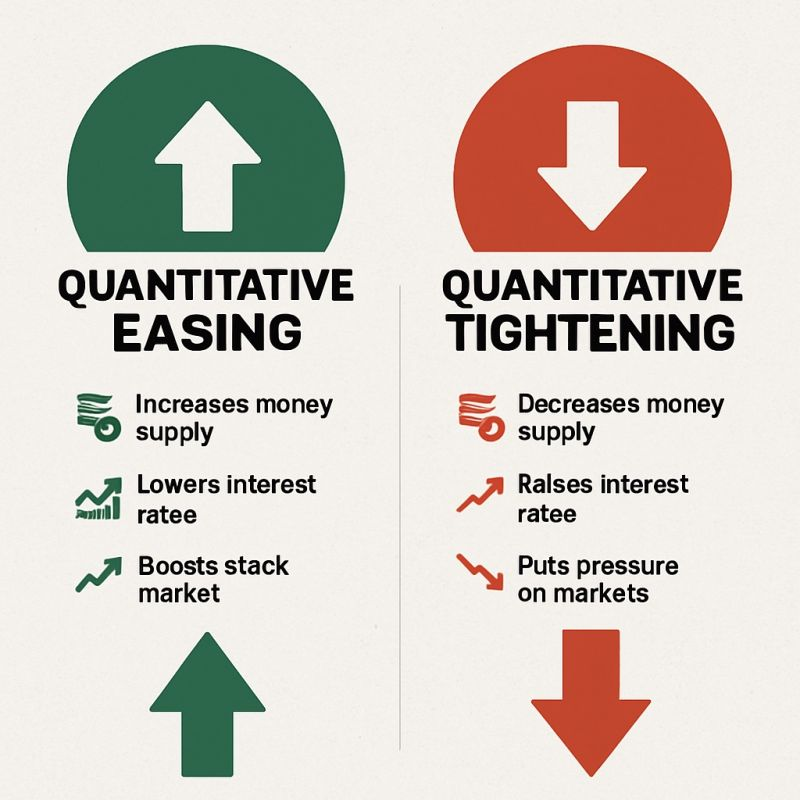 در QE (تسهیل کمی)، بانک مرکزی اوراق میخرد، پول وارد اقتصاد میکند و نرخهای بهره را پایین میآورد. در QT (سختگیری کمی)، بانک مرکزی ترازنامه را کوچک میکند، نقدینگی کم میشود و نرخهای بهره بالا میرود.