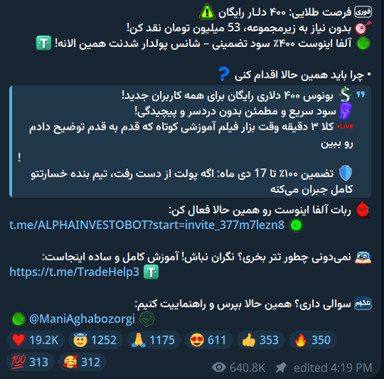 اگر با جستجوی شخصی یا معرفی دوستان خود وارد بعضی کانال‌های تلگرامی شوید، ممکن است پیام‌هایی پین‌شده در این کانال‌ها ببینید که عناوینی مثل «فرصت طلایی: ۴۰۰ دلار رایگان» و «آلفا اینوست ۴۰۰% سود تضمینی» دارند. کمی پایین‌تر از این پیام می‌خوانید «چرا باید همین حالا اقدام کنی؟» و «ربات آلفا اینوست رو همین حالا فعال کن».