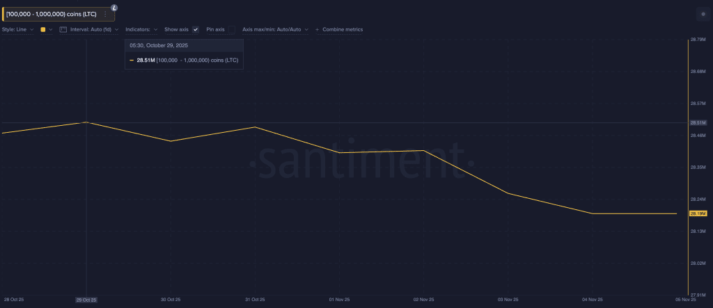 نهنگ‌ها نیز از ۲۹ اکتبر شروع به کاهش ذخایرشان کرده‌اند. عرضه آن‌ها از ۲۸.۵۱ میلیون به ۲۸.۱۹ میلیون LTC کاهش یافته است (معادل ۰.۳۲ میلیون کوین). با قیمت فعلی، این مقدار تقریباً معادل ۲۸.۸ میلیون دلار توکن است.
