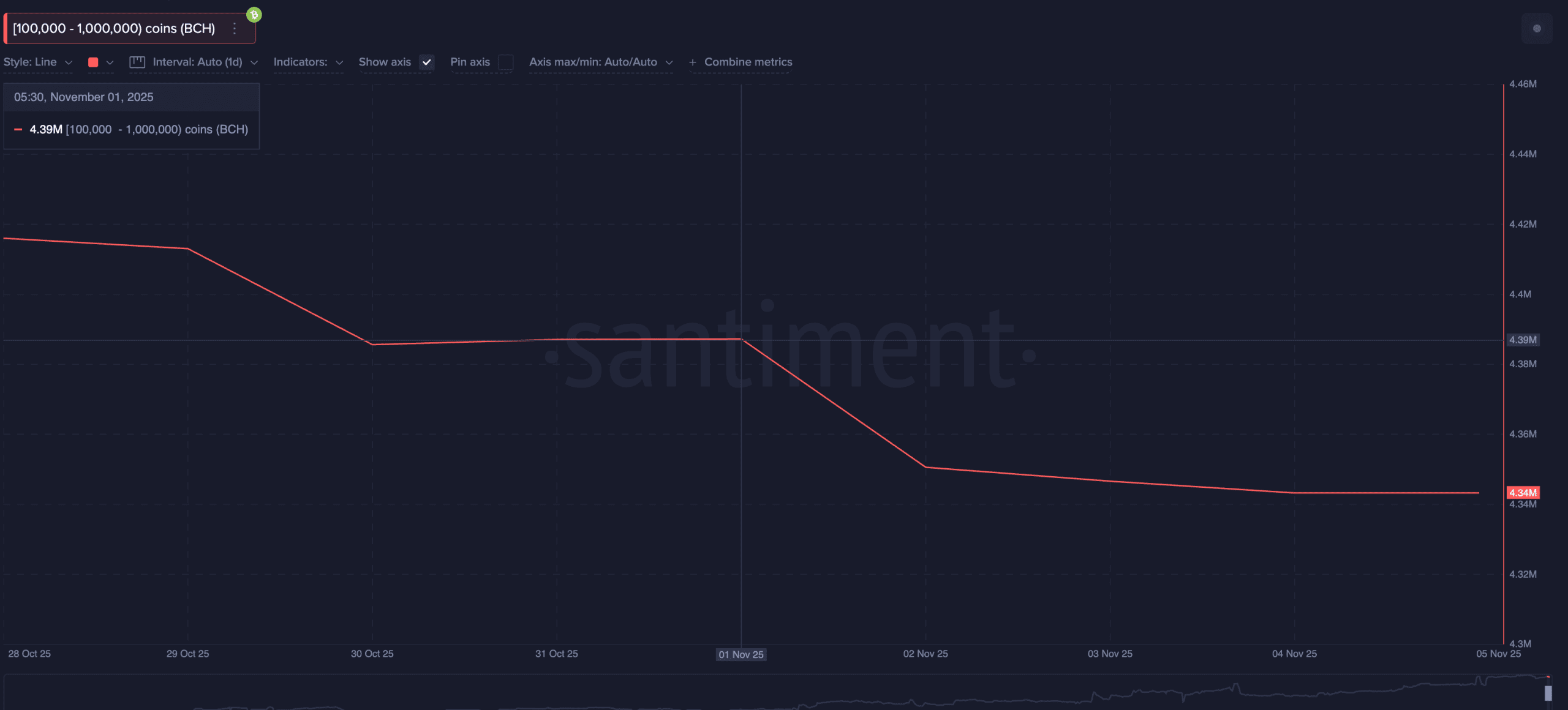هولدرهای بزرگ (آدرس‌هایی که ۱۰۰,۰۰۰ تا ۱ میلیون BCH دارند) از اوایل نوامبر (آبان) شروع به فروش موقعیت‌های خود کرده‌اند. ذخایر آن‌ها هم را از ۴.۳۹ میلیون به ۴.۳۴ میلیون BCH رسیده‌ و تقریباً ۵۰,۰۰۰ کوین (حدود ۲۵ میلیون دلار) کاهش یافته‌ است.