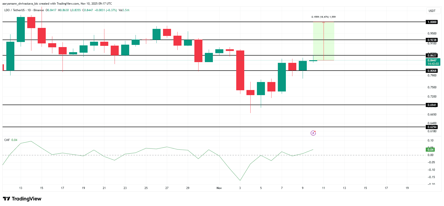 از نظر تکنیکال هم قیمت لیدو دائو توکن سیگنالهای امیدوارکنندهای صادر کرده است. شاخص جریان پول چایکین (CMF) بالای خط صفر باقی مانده که ورودیهای قوی به این دارایی را تأیید میکند. اگر این حرکت حفظ شود، این آلت کوین میتواند مقاومتهای ۰.۸۶ دلار و ۰.۹۲ دلار را بشکند و به سمت ۱.۰۰ دلار حرکت کند.