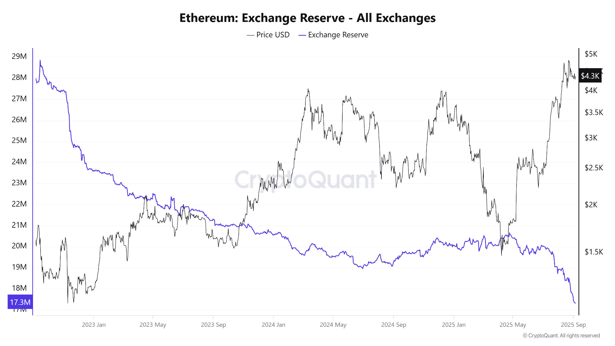 در دو ماه گذشته، خبر خرید اتریوم توسط شرکت‌های مختلف تقریباً هر روز منتشر شده است. طبق داده‌های Strategic ETH Reserve، تا ۵ سپتامبر (۱۴ شهریور) شرکت‌ها بیش از ۴.۷ میلیون ETH به ارزش ۲۰.۵ میلیارد دلار برای ذخایر استراتژیک خود خریداری کرده‌اند. در نتیجه، موجودی ETH در صرافی‌ها به‌طور چشمگیری کاهش یافته و سرعت این روند در ماه‌های اخیر شدت گرفته است.
