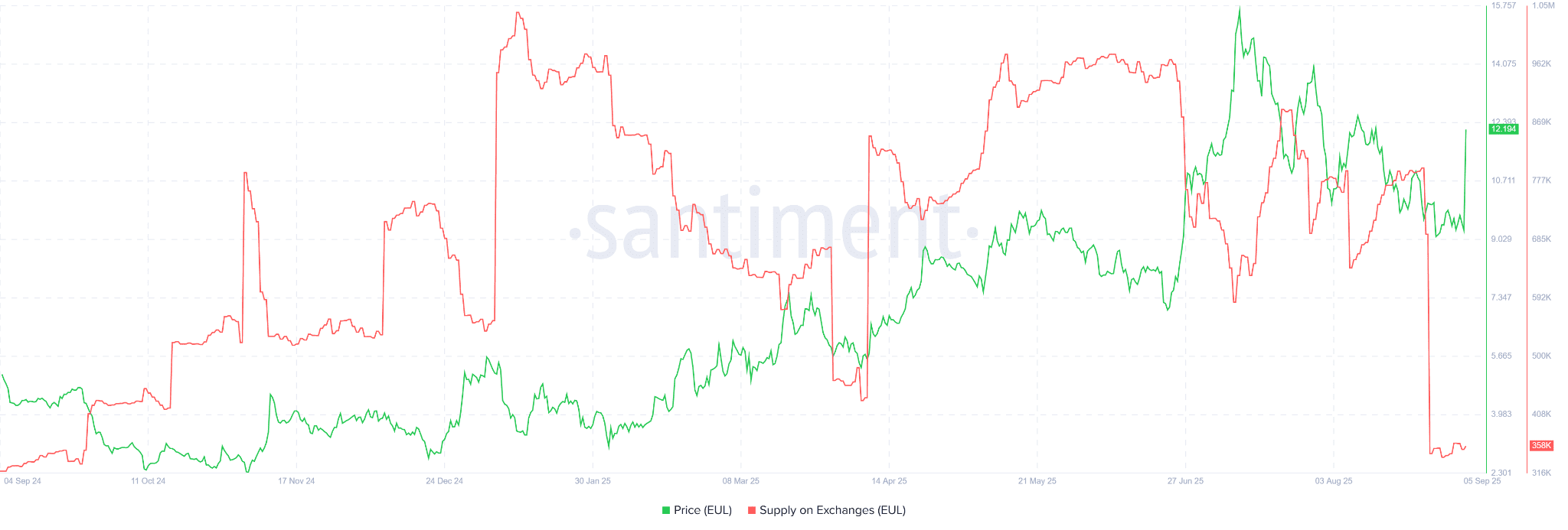داده‌های Santiment نشان می‌دهد که ذخایر EUL در صرافی‌ها در هفته اول سپتامبر به پایین‌ترین سطح یک‌ساله، یعنی ۳۵۸٬۰۰۰ توکن رسید. در مقایسه اوج ۷۹۵٬۰۰۰ EUL در اواخر آگوست، بیش از ۴۳۷٬۰۰۰ توکن از صرافی‌ها خارج شده‌ است.‌