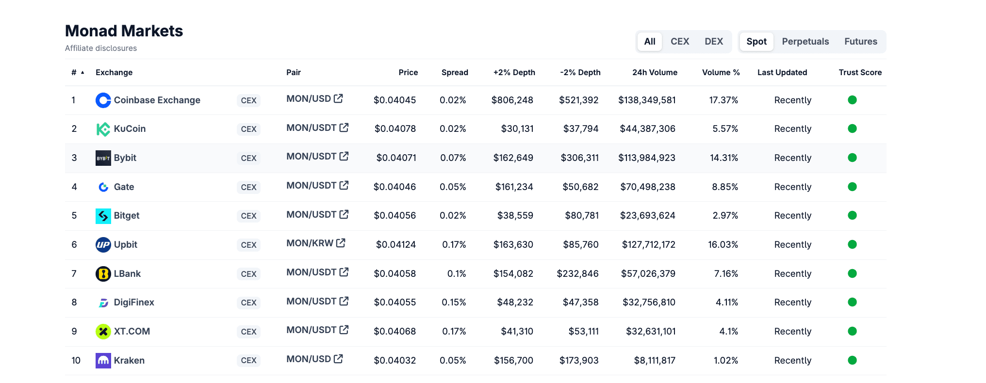 موناد (MON)، زنجیره مبتنی بر EVM با سرعت بالا، تنها چند روز پیش در CEXها لیست شد. این آلت کوین در حال حاضر در کوین بیس، کوکوین، بای‌بیت، گیت، بیت‌گت و آپ‌بیت قابل معامله است.