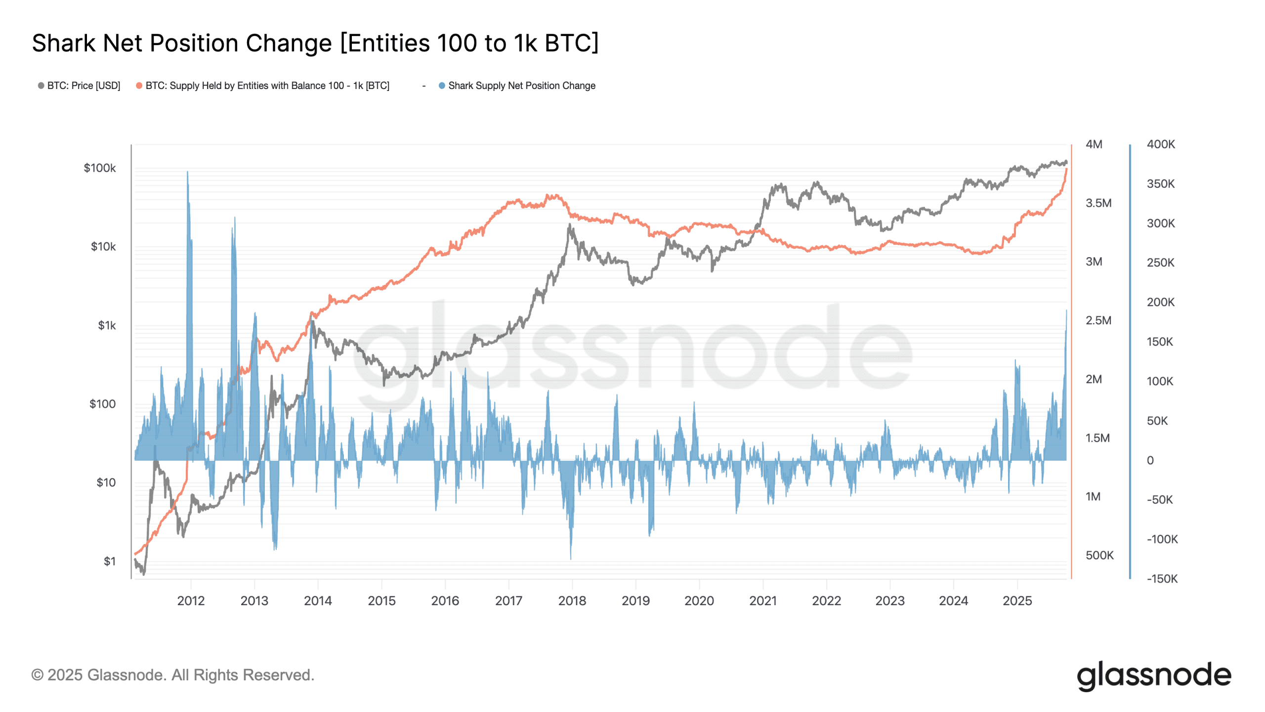 شاخص تغییر خالص موقعیت کوسهها (Shark Net Position Change) در نمودار روزانه، که کیف پولهای حاوی ۱۰۰ تا ۱۰۰۰ BTC را ردیابی میکند، به ۱۹۰,۲۹۶ افزایش یافته است که بالاترین سطح آن از سپتامبر ۲۰۱۲ است.