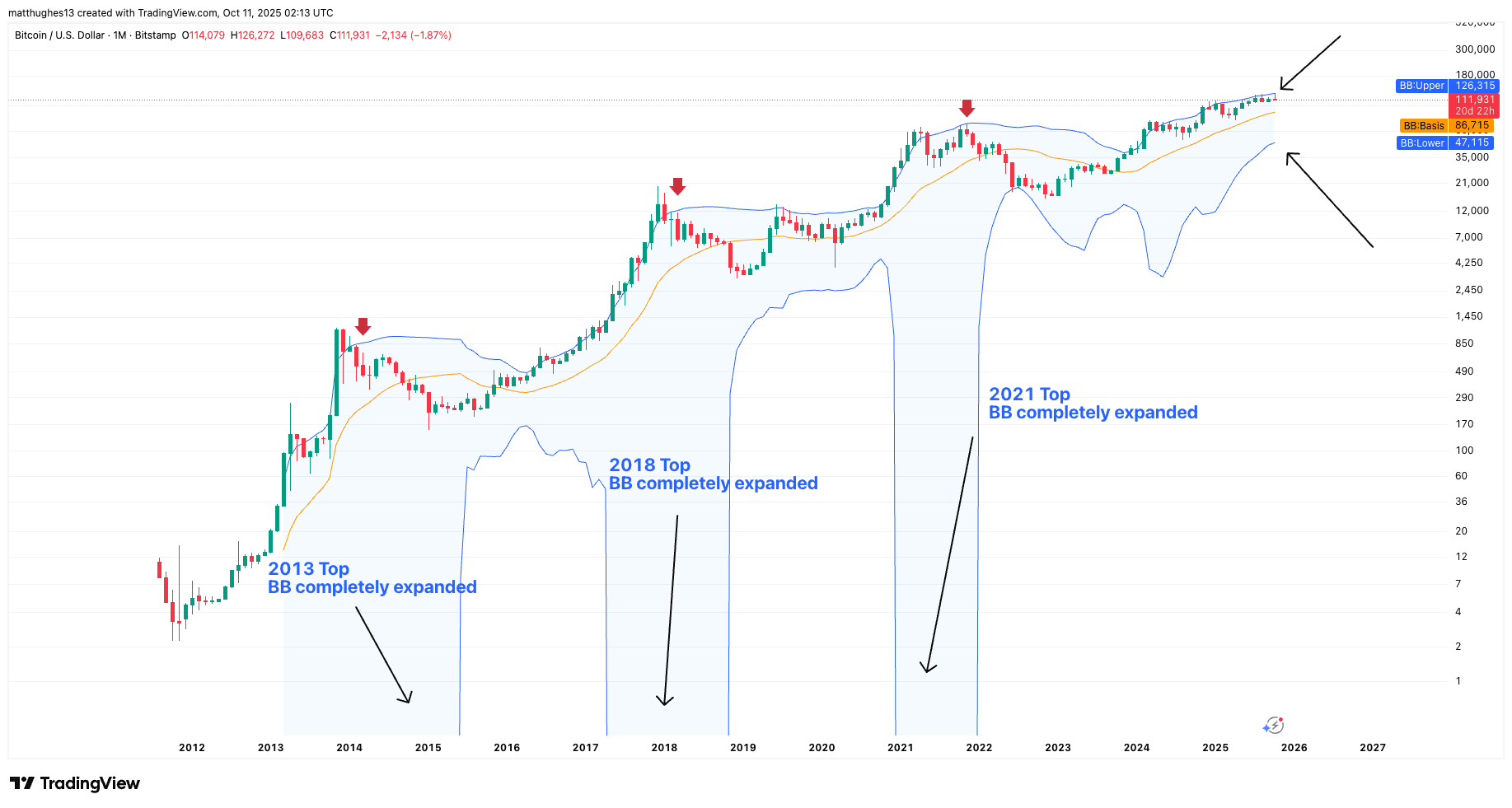 در چرخههای صعودی قبلی، از جمله ۲۰۱۳، ۲۰۱۸ و ۲۰۲۱، بیت کوین دقیقاً زمانی به اوج رسید که این باندهای ماهانه از هم فاصله زیادی گرفتند. اما در حال حاضر، این باندها هنوز در حال باریک شدن یا «فشرده شدن» هستند که ممکن است پیشدرآمد رالیهای بیشتری باشد. این تحلیلگر گفت: