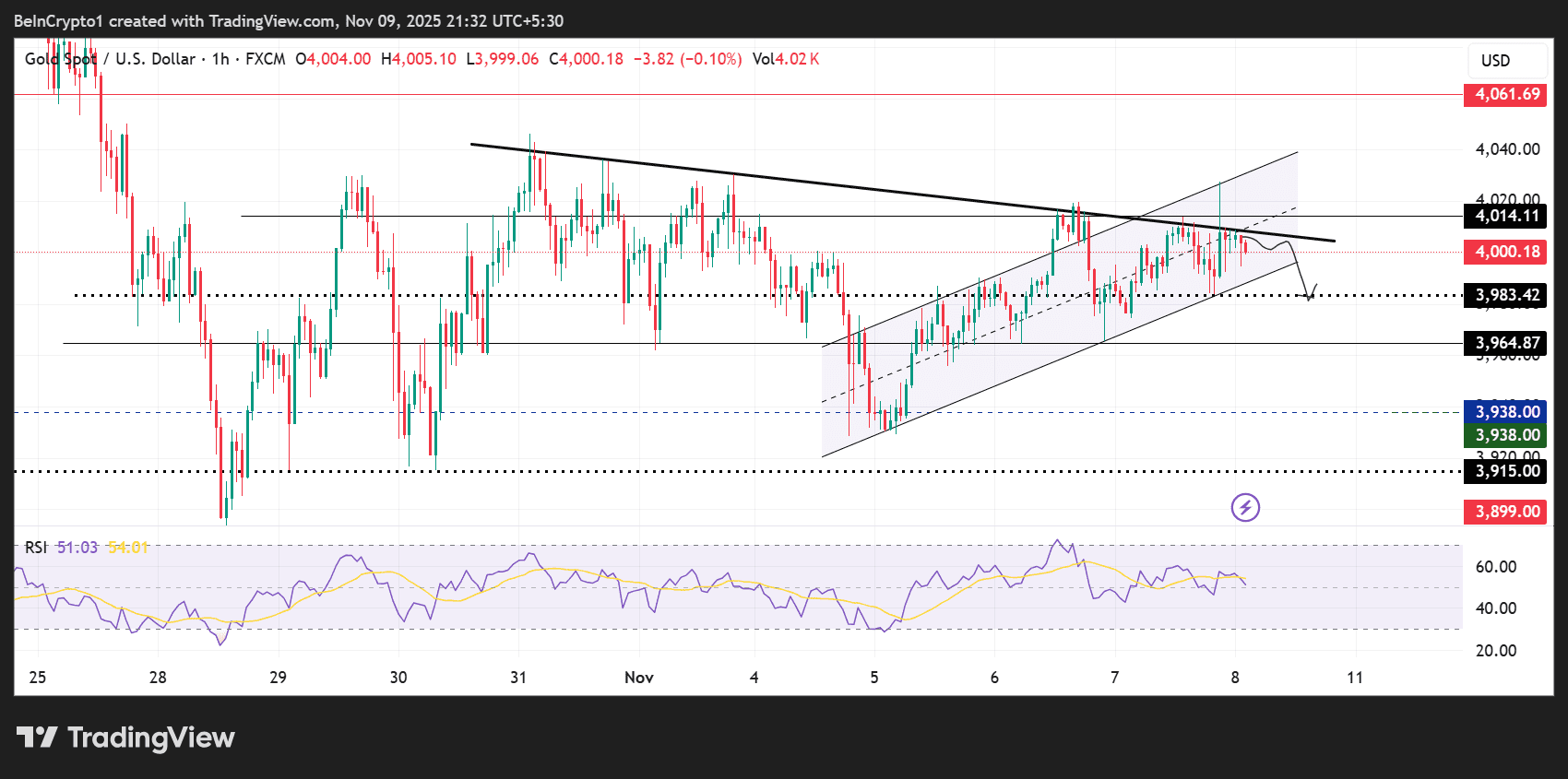 قیمت طلا از اواخر اکتبر (مهر) یک خط روند نزولی را آزمایش کرده و هر بار که این کار را کرده، با اصلاح مواجه شده است. بر این اساس آزمایش اخیر آن هم ممکن است تفاوتی نداشته باشد و قیمت XAU می‌تواند به ۳,۹۸۳ دلار کاهش یابد.