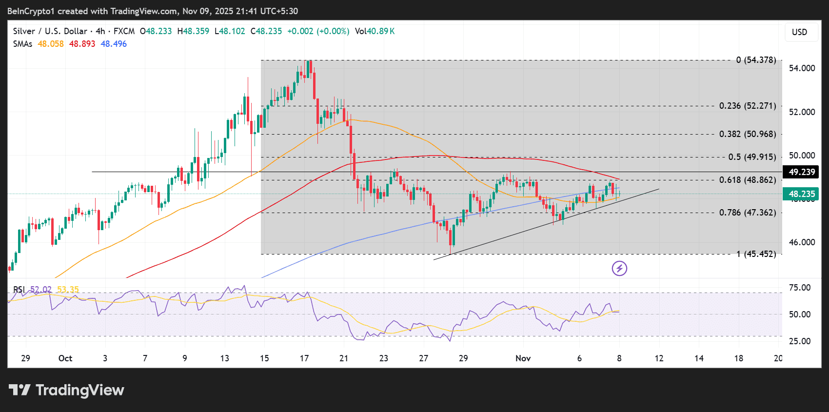 از ۲۵ اکتبر، خط روند صعودی حمایت قابل توجهی برای قیمت نقره فراهم کرده است،. اکنون، با وجود مقاومت‌های متعدد این حمایت با یک آزمایش جدید روبه‌رو شده‌ است.