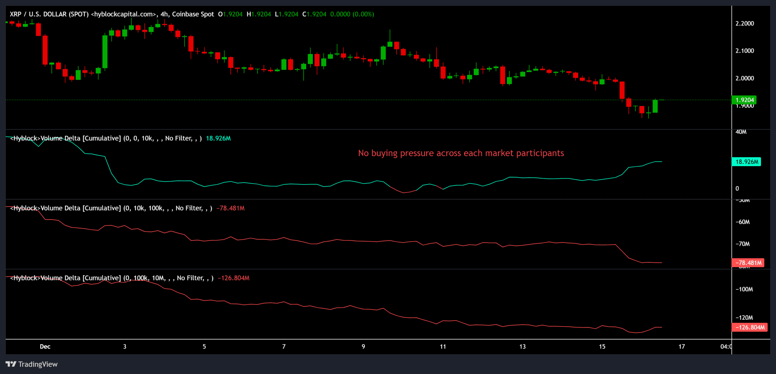 داده‌های جریان سفارش از های‌بلاک کپیتال این زمینه نزولی را تقویت کرد. دلتای حجم تجمعی XRP برای دسامبر در تمام دسته‌های شرکت‌کننده منفی است: کیف پول‌های خرد (۰ تا ۱۰,۰۰۰ دلار دارایی) با -۸.۶۸ میلیون دلار، کیف پول‌های متوسط (۱۰,۰۰۰ تا ۱۰۰,۰۰۰ دلار دارایی) با -۶.۸۹ میلیون دلار و کیف پول‌های بزرگ (۱۰۰,۰۰۰ تا ۱۰ میلیون دلار دارایی) با -۳۴ میلیون دلار. این داده‌ها نشان‌دهنده فروش خالص مداوم است، بدون اینکه هیچ گروهی فشار خرید پایدار را از خود نشان دهد.
