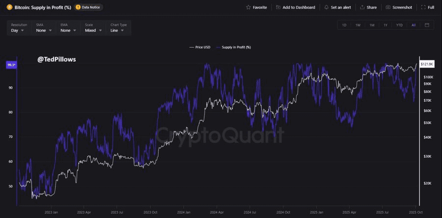 تحلیلگری به نام تد پیلوز (Ted Pillows) دادههایی را به اشتراک گذاشت که نشان میدهد تقریباً همه عرضه BTC با قیمت فعلی سودآور است. در سه باری که بیش از ۹۹ درصد از عرضه بیت کوین در سود بود، قیمت بین ۳ تا ۱۰ درصد اصلاح شد.