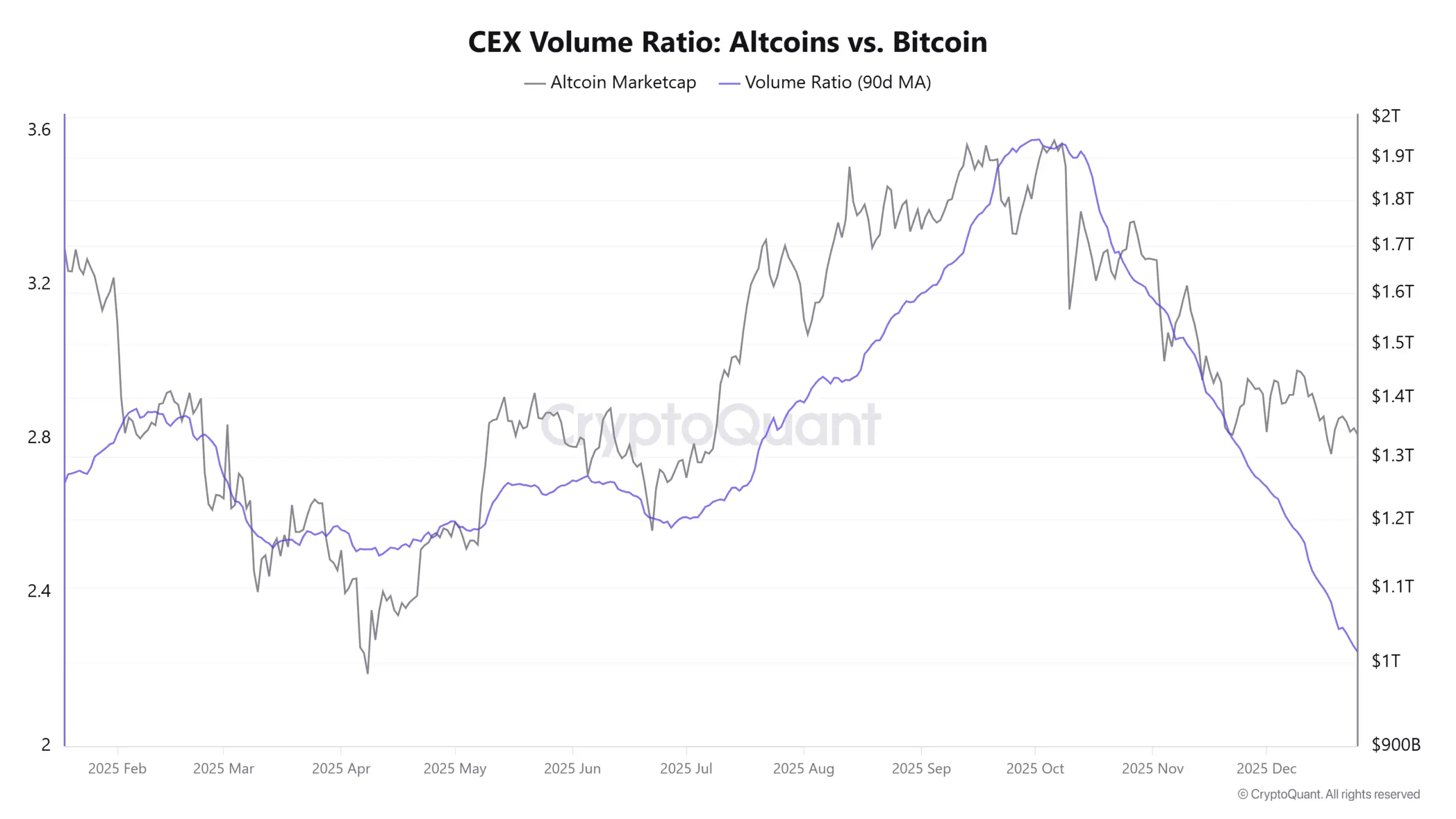 از یک دیدگاه متعادلتر، دادههای کریپتوکوانت نشان میدهد که نسبت حجم معاملات آلت کوین به حجم معاملات بیت کوین در صرافیهای متمرکز (CEXs) به پایینترین سطح خود در یک سال گذشته رسیده است.