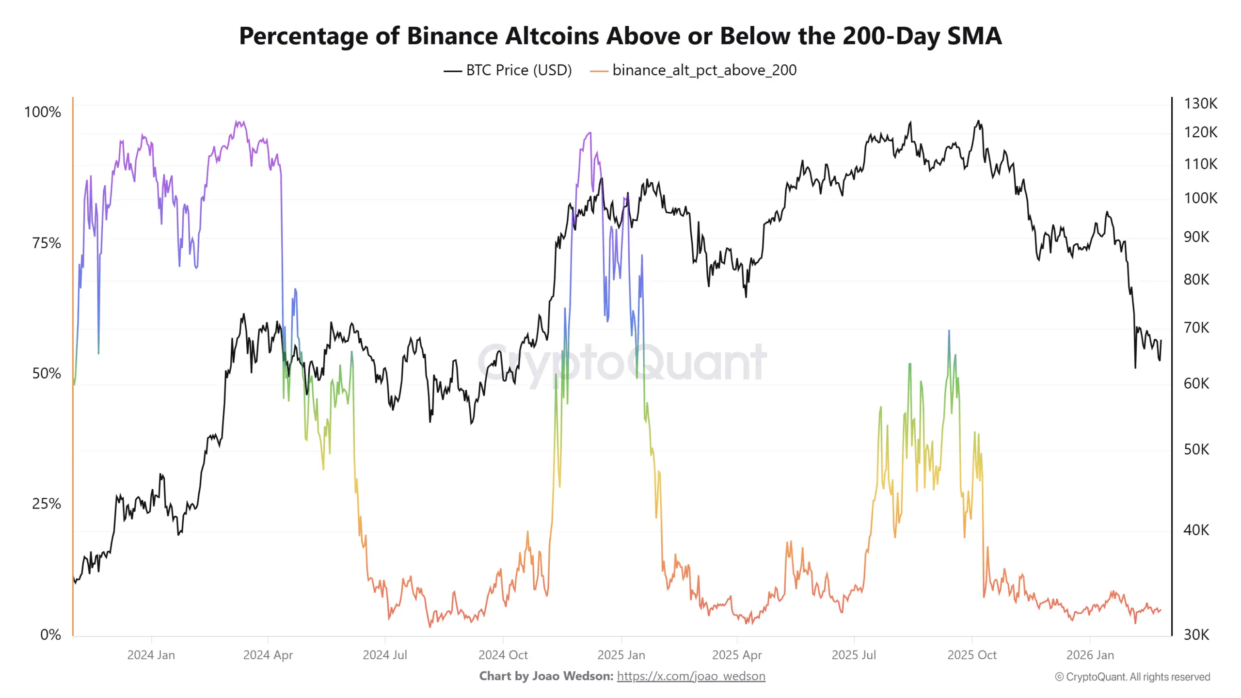 دادههای کریپتوکوانت نشان میدهد که تنها حدود ۵ درصد از آلت کوینهای لیست شده در بایننس بالاتر از میانگین متحرک ساده ۲۰۰ روزه (SMA ۲۰۰ روزه) خود معامله میشوند. این بدان معناست که ۹۵ درصد از آنها زیر این سطح باقی ماندهاند که نشاندهنده عملکرد ضعیف فعلی آلت کوینها است.