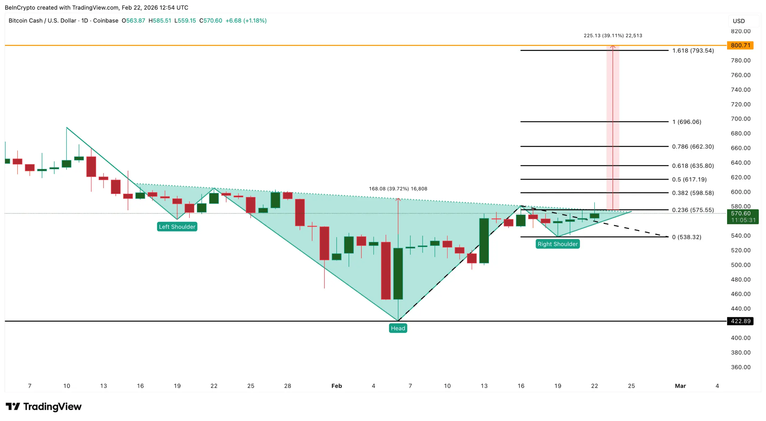 از نظر تکنیکال، BCH در حال شکل‌گیری الگوی سر و شانه معکوس است که پیش‌بینی یک شکست صعودی را می‌دهد. شکست بالای ۵۷۵ دلار می‌تواند BCH را به حدود ۷۹۳–۸۰۰ دلار برساند، در حالی که افت زیر ۵۳۸ دلار ساختار صعودی را تضعیف می‌کند و زیر ۴۲۲ دلار کل الگو را باطل می‌کند.