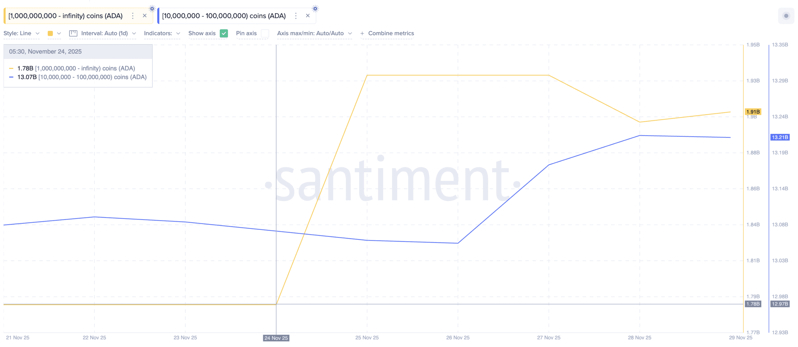 دو گروه اصلی از ADA در طول بخش پایانی نوامبر در حال خرید بوده‌اند. بزرگترین هولدرها، کیف پول‌هایی با بیش از ۱ میلیارد ADA، از ۲۴ نوامبر شروع به اضافه کردن ذخایرشان کرده‌اند. از آن زمان، آنها در مجموع ۱۳۰ میلیون ADA انباشته کرده‌اند. کیف پول‌های ۱۰ تا ۱۰۰ میلیون ADA هم در ۲۶ نوامبر شروع به خرید کرده و ۱۵۰ میلیون ADA اضافه کرده‌اند.