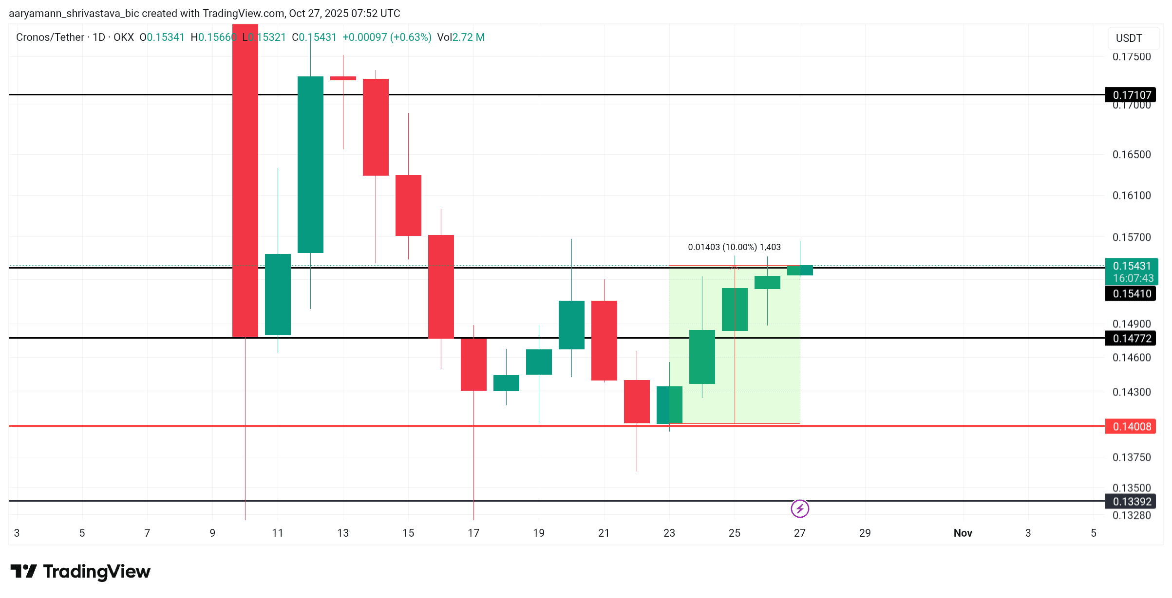 این ارتقاء میتواند قیمت CRO را که در هفته گذشته ۱۰ درصد افزایش یافته و به ۰.۱۵۴ دلار رسیده، بیشتر تقویت کند. اگر این سطح به یک حمایت قوی تبدیل شود، ممکن است این آلت کوین را به سمت ۰.۱۶۰ دلار و ۰.۱۷۱ دلار سوق دهد.