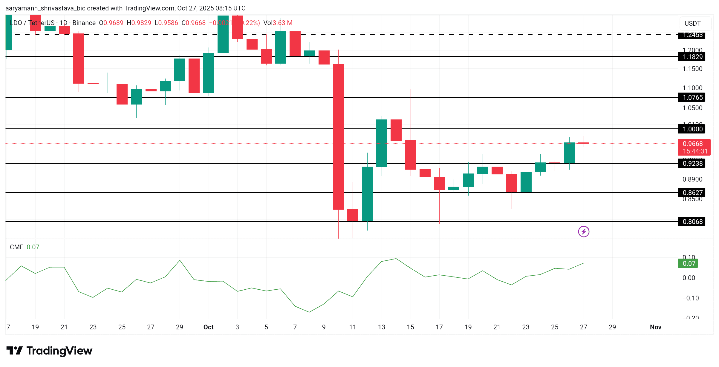اگر شتاب صعودی این آلت کوین حفظ شود، قیمت LDO میتواند از ۱.۰۰ دلار عبور کرده و به سمت ۱.۰۷ دلار حرکت کند. جریان نقدینگی چایکین (CMF) با وجود شک و تردیدهای باقیمانده، ورود مداوم سرمایهگذاران را نشان میدهد.