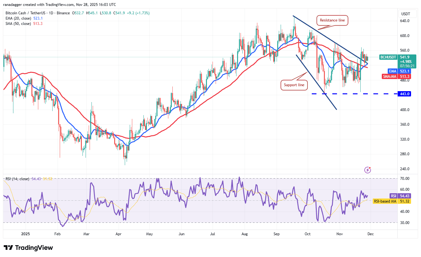 میانگین متحرک نمایی ۲۰ روزه (موج آبی رنگ، ۵۲۳ دلار) صعودی شده‌ است و شاخص قدرت نسبی (RSI) درست بالای نقطه میانی قرار دارد. این امر نشان‌دهنده یک مزیت جزئی برای خریداران است. خریداران باید قیمت BCH را بالای ۵۶۸ دلار ببرند تا یک حرکت صعودی جدید را به سمت ۵۸۰ دلار و ۶۰۶ دلار آغاز کنند.