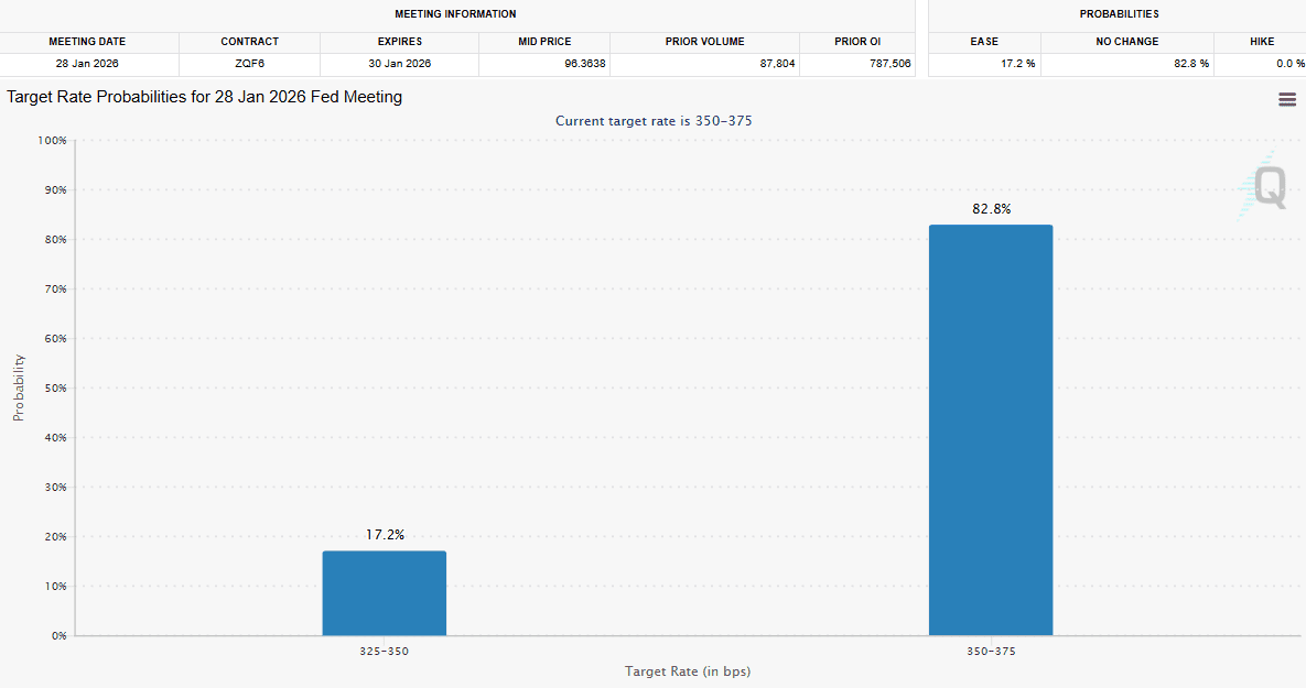• تنها ۱۷.۲ درصد احتمال کاهش نرخ بهره در نشست ژانویه فدرال رزرو وجود دارد که فشار مضاعفی بر روند قیمت BTC وارد کرده است.