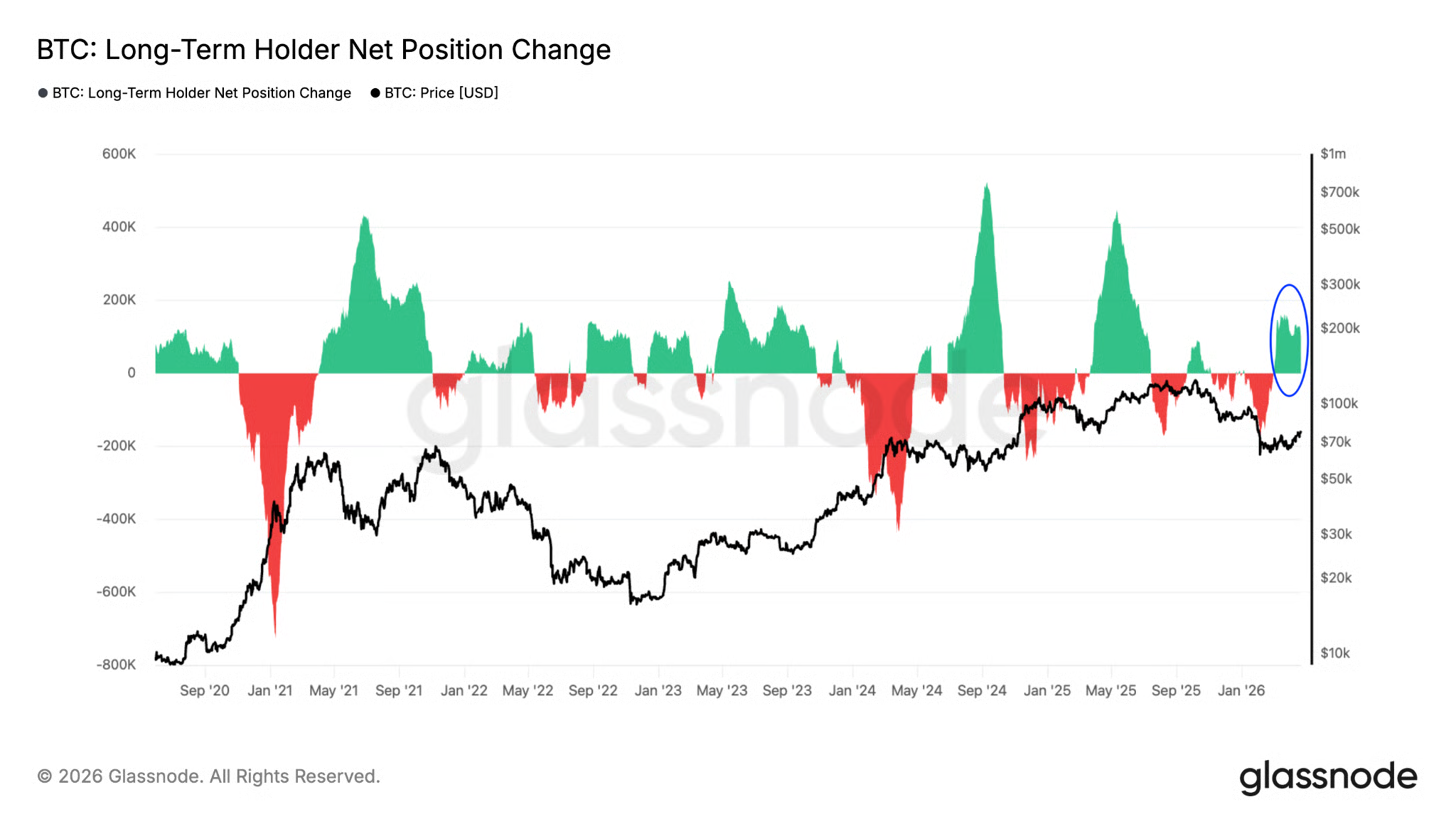 علاوه بر این هولدرهای بلندمدت (کسانی که بیش از ۱۵۵ روز BTC خود را نگه داشتهاند) خریدهای خود را افزایش دادهاند. تغییر خالص پوزیشن این افراد از اوایل مارس (اسفند ۱۴۰۴) مثبت بوده و تنها در ۳۰ روز گذشته، حدود ۱۳۰,۰۰۰ واحد BTC خریداری شده است.