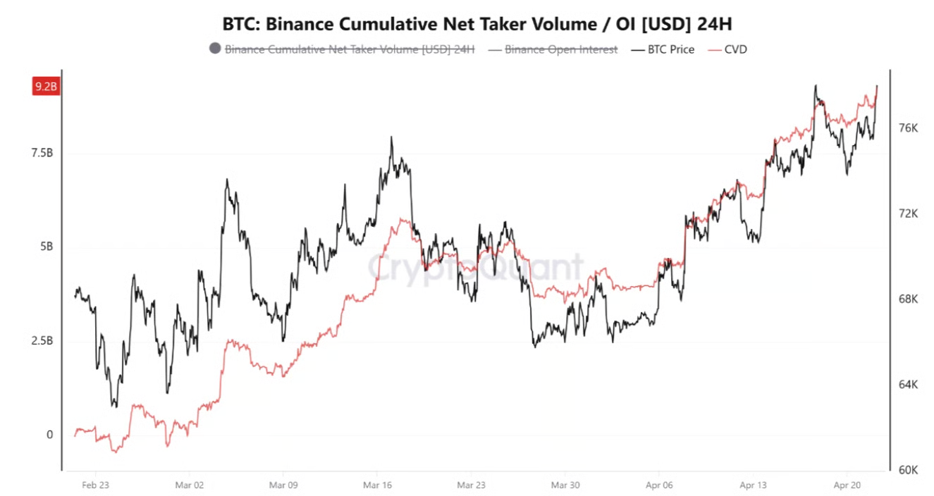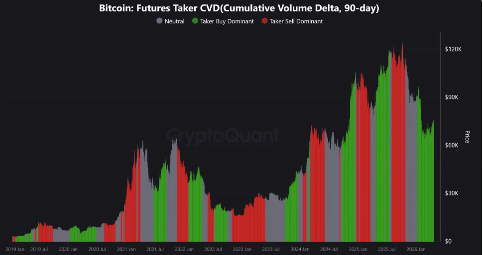 به گزارش کوین تلگراف، دادههای پلتفرم CryptoQuant نشان میدهد که «حجم خالص تجمعی تیکرها» (Cumulative Net Taker Volume) حاکی از ورود خریداران به بازار و بازگشت تقاضا برای مشتقات بیت کوین در بایننس است.