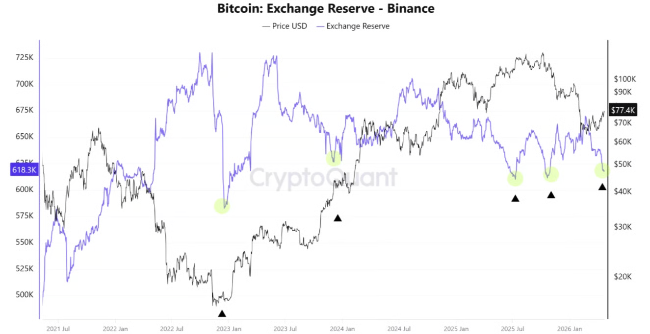 دادههای ذخایر صرافیها نشاندهنده کمبود عرضه است، چرا که ذخایر BTC در بایننس بهطور قابلتوجهی رو به کاهش است. به عبارت دقیقتر ذخایر بیت کوین این صرافی از حدود ۶۷۵,۰۰۰ واحد در اوایل ژانویه (دی ۱۴۰۴) به حدود ۶۱۸,۳۰۰ واحد رسیده است.