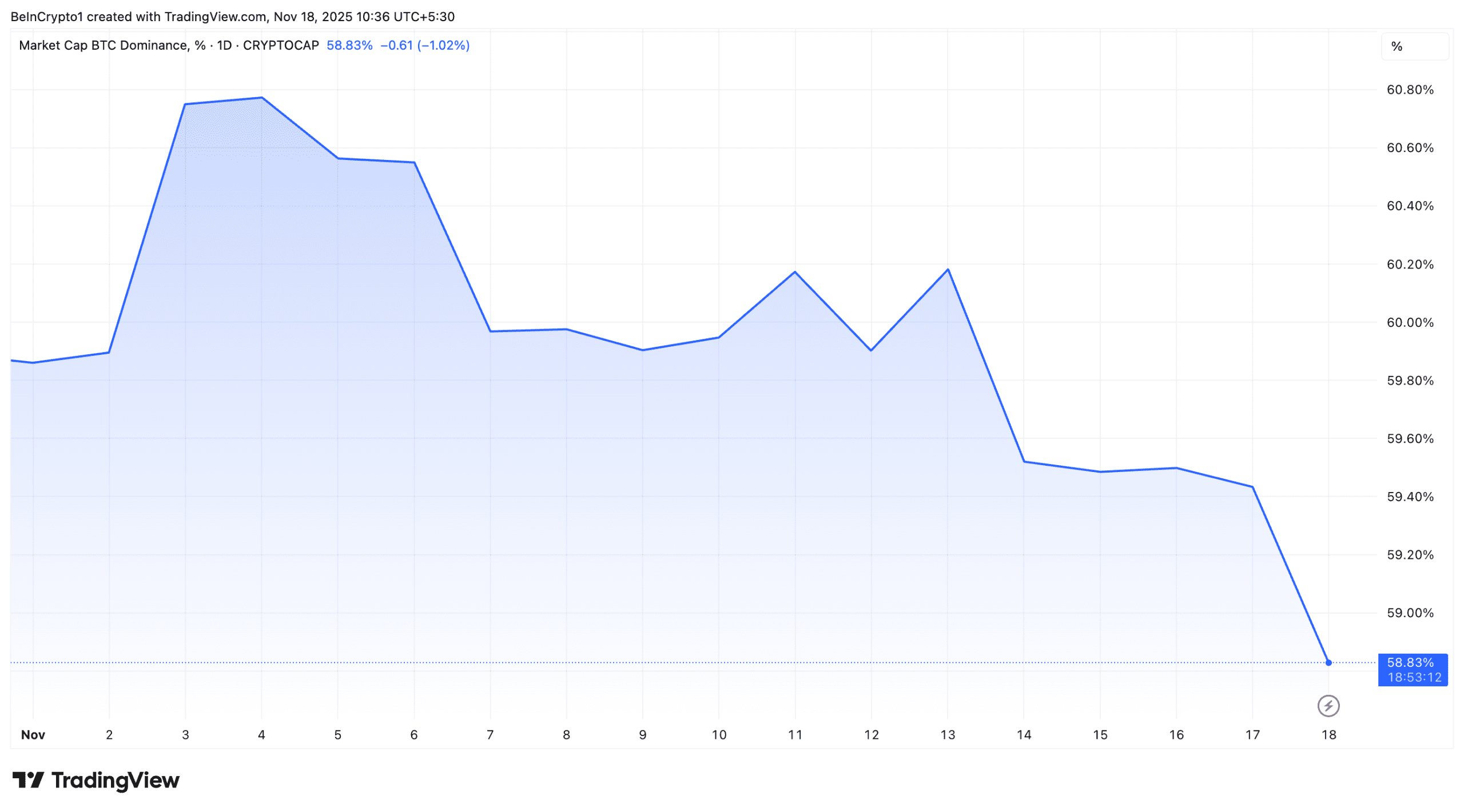 به گزارش بیاینکریپتو، دامیننس بیت کوین نشاندهنده سهم بیت کوین از کل ارزش بازار کریپتوکارنسی است. این شاخص برای درک حرکت سرمایه بین بیت کوین و آلت کوینها بسیار حیاتی است. براساس دادههای بازار، دامیننس BTC در نوامبر ۲۰۲۵ کاهش قابلتوجهی داشته و از ۶۱.۴ به ۵۸.۸ درصد رسیده است.