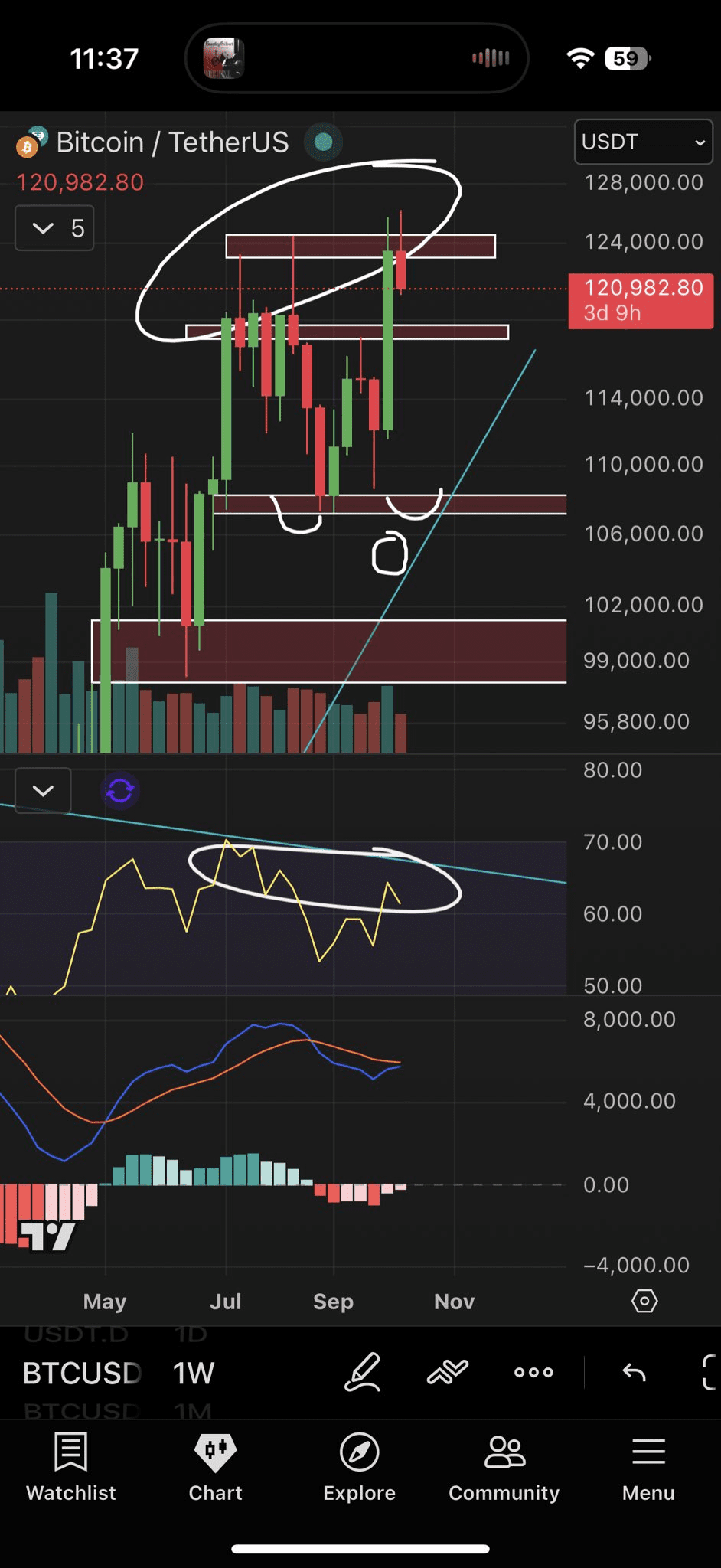 یک یادآوری دوستانه اینکه ما بار دیگر واگراییهای نزولی بیشتر، حجم پایین و نبود قدرت در بازههای زمانی بالا (HTF) را ثبت میکنیم. هم در نمودار هفتگی (1W) و هم ماهانه (1M). احتمالاً دوباره به ۱۰۸٬۰۰۰ دلار میرسیم. من در این جا قدرتی نمیبینم.