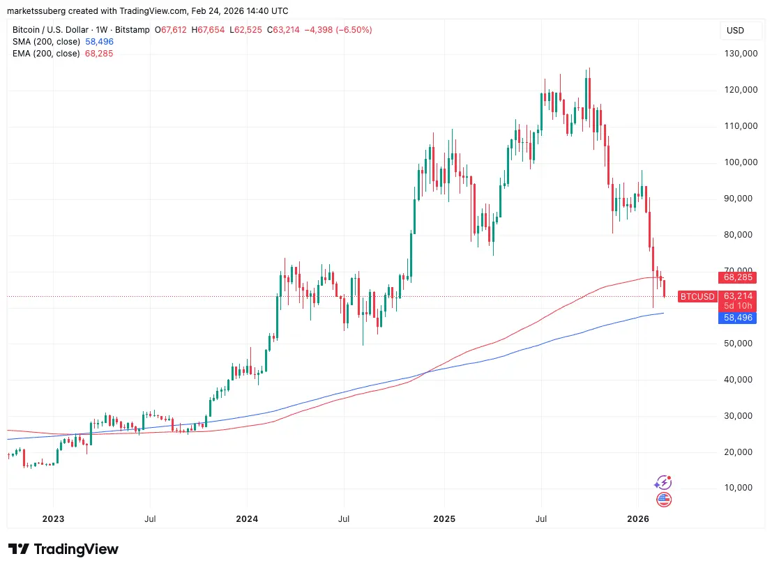 کندل بیت کوین زیر EMA 200 هفتهای (سیاه) بسته شد. این از نظر فنی به این معنی است که EMA به عنوان حمایت از دست رفته است و قیمت میتواند آن را در هر بازیابی آتی به مقاومت تبدیل کند. از نظر تاریخی در طول چرخهها، هرگاه بیت کوین یک کلوز کندل هفتگی زیر EMA 200 هفتهای و به دنبال آن یک بازآزمایی نزولی انجام میداد، منجر به تسریع نزولی بیشتر میشد.