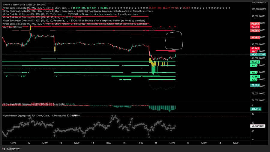 با نبردی در دفتر سفارشات BTC از خواب بیدار میشویم… نقدینگی پیشنهاد خرید در ۸۵٬۰۰۰ دلار برای دفاع از حمایت در میانگین متحرک ساده ۱۰۰ هفتهای متمرکز شده است… در همین حال، پیشنهادهای فروش بالای ۸۷٬۰۰۰ دلار در حال انباشت هستند تا از یک شکست صعودی جلوگیری کنند.