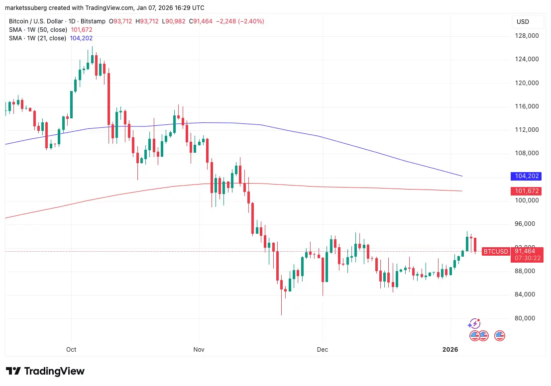 نمودار یک روزه BTC/USD با SMA ۲۱ و ۵۰ هفته‌ای