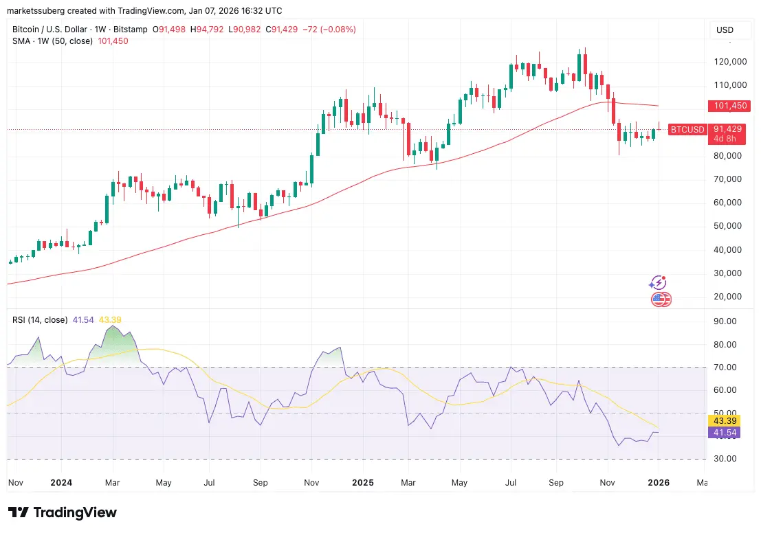 نمودار یک‌هفته‌ای BTC/USD با SMA 50، داده‌های RSI بیت کوین