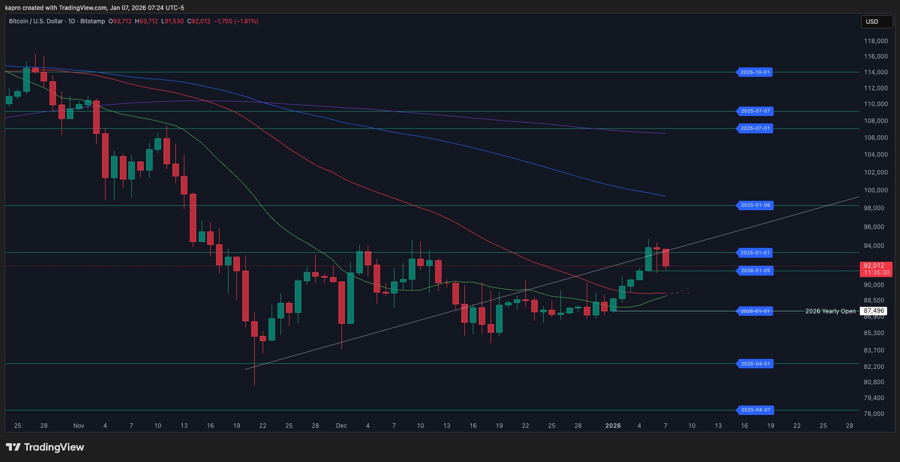 فایرچارتس نبردی در زمان واقعی را در دفتر سفارش BTC نشان می‌دهد. خریداران در تلاشند تا از حمایت در سطح Timescape مورخ ۰۵-۰۱-۲۰۲۶ دفاع کنند، اما به نظر می‌رسد نهنگ‌ها به دنبال آزمایش حمایت نزدیک‌تر به اوپن سالانه هستند، قبل از اینکه یک تقاطع طلایی در نمودار روزانه شکل گیرد تا رالی بعدی را آغاز کند.