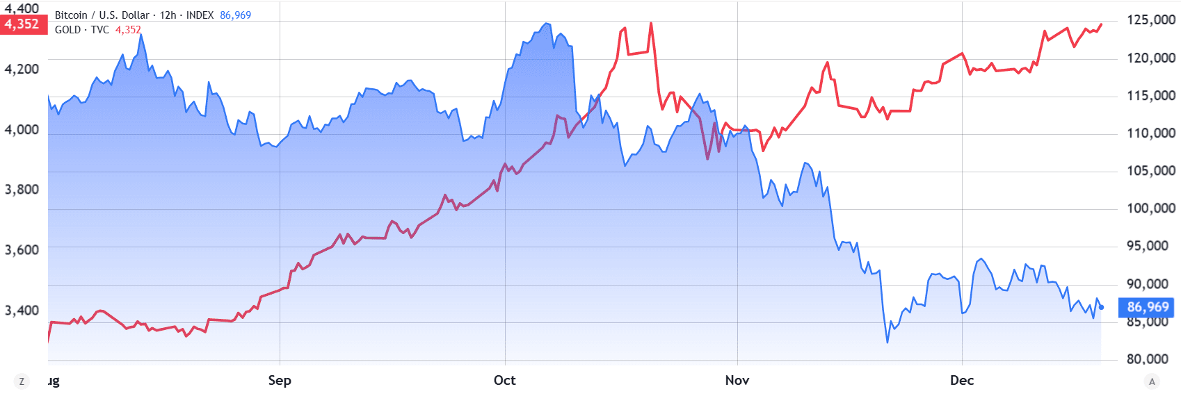 صرف‌نظر از ماهیت غیرمتمرکز بیت‌ کوین و جذابیت بلندمدت آن، طلا در بحبوحه عدم اطمینان اقتصادی جاری به عنوان ابزار بهتری برای پوشش ریسک ظاهر شده است.