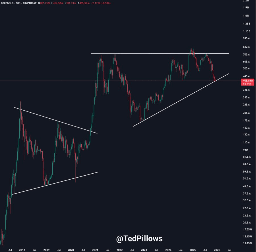 بیت کوین در برابر طلا در یک سطح حمایت حیاتی قرار دارد. آخرین بازار نزولی بیت‌ کوین رسماً زمانی آغاز شد که این حمایت را از دست دادیم. انتظار دارم که برای مدتی اینجا تثبیت شویم، اما شکست سطح احتمالاً در چند هفته آینده رخ خواهد داد.