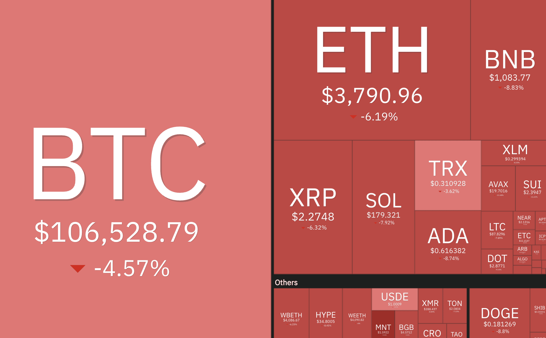 به گزارش دبلاک، قیمت بیت کوین طی ۲۴ ساعت گذشته به شدت کاهش یافته‌ و به ۱۰۶٬۰۰۰ دلار رسیده‌ است. قیمت اتریوم نیز به زیر ۳٬۸۰۰ دلار رسیده‌ است. رمزارزهای BNB، ریپل و سولانا نیز کاهش چشمگیری را تجربه کردند.