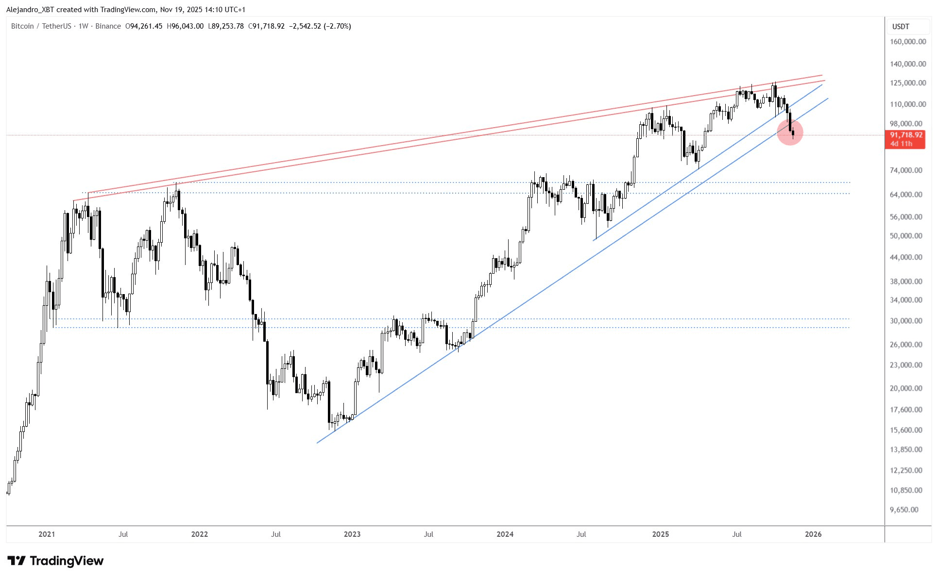 تحلیلگری به نام AlejandroBTC موضع بسیار نزولیتری دارد. او اشاره کرد که بیت کوین از الگوی کنج صعودی بزرگی که ماهها هشدار میداد، خارج شده است. در تحلیل تکنیکال، شکست الگوی کنج صعودی معمولاً پایان یک روند اصلی را نشان میدهد.
