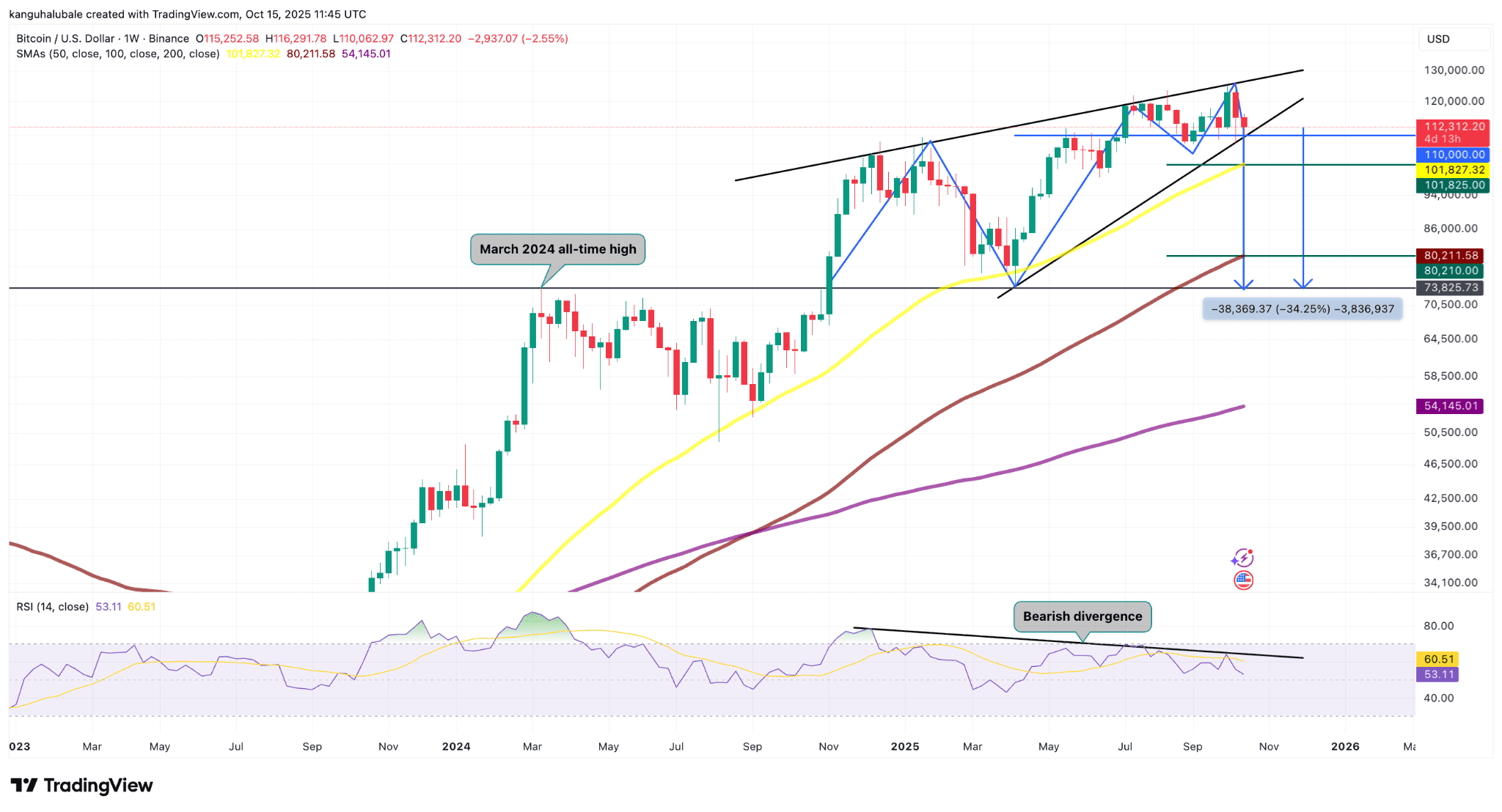سناریوی نزولی بیتکوین با واگرایی صعودی قیمت و شاخص قدرت نسبی (RSI) در نمودار بالا پشتیبانی میشود. تحلیلگری به اسم کاپیتان فایبیک تاکید کرد: