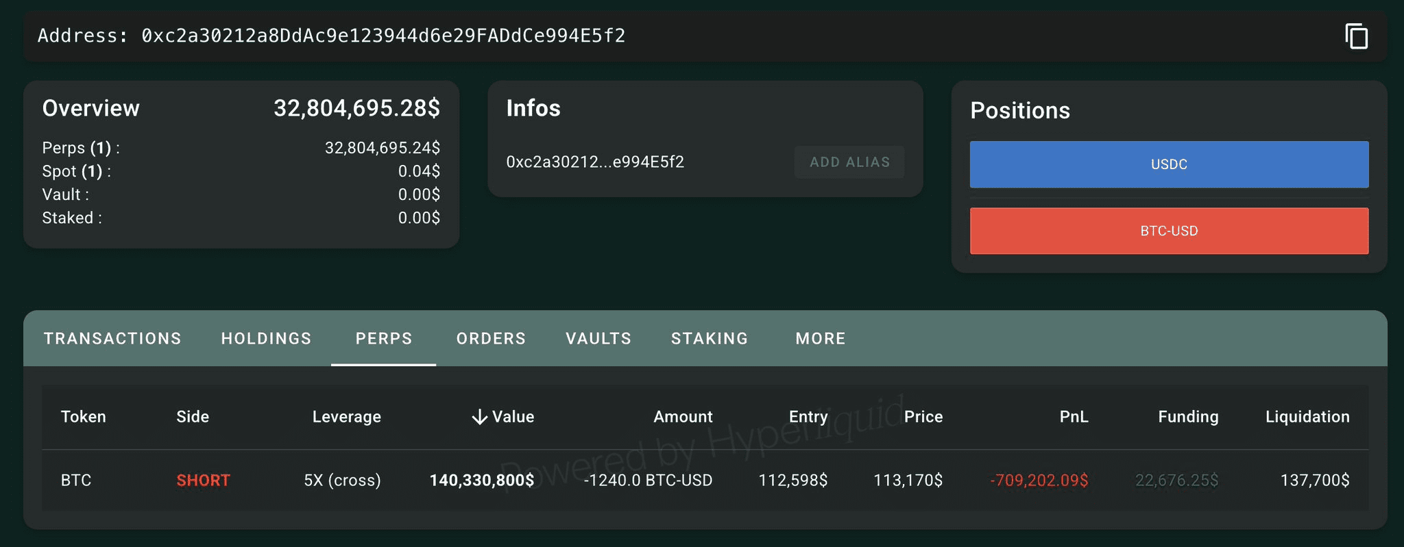 - دادهها حاکی از آن است که یک نهنگ در Hyperliquid موقعیت فروش ۱۴۰ میلیون دلاری با اهرم ۵ برابر باز کرده است.