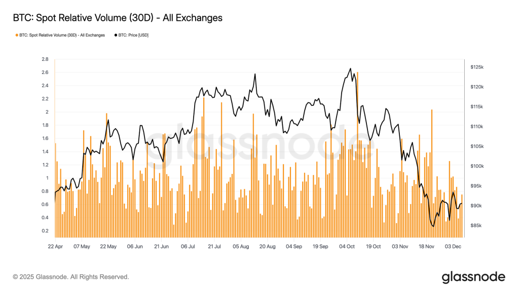 همزمان با کاهش جریان سرمایه ETFها، حجم نسبی معاملات اسپات بیت کوین نیز به کف محدوده ۳۰روزه خود نزدیک شده است. معاملات بیت کوین در طول دو ماه اخیر کاهش یافته که بازتابی از افت قیمت و کاهش فعالیت سرمایه‌گذاران در بازار است. کاهش حجم معاملات نشان می‌دهد که سرمایه‌گذاران موضع‌ محافظه‌کارانه‌ دارند و جریان ضعیف نقدینگی توانایی جذب نوسانات یا حمایت از رشد قیمت را ندارد.