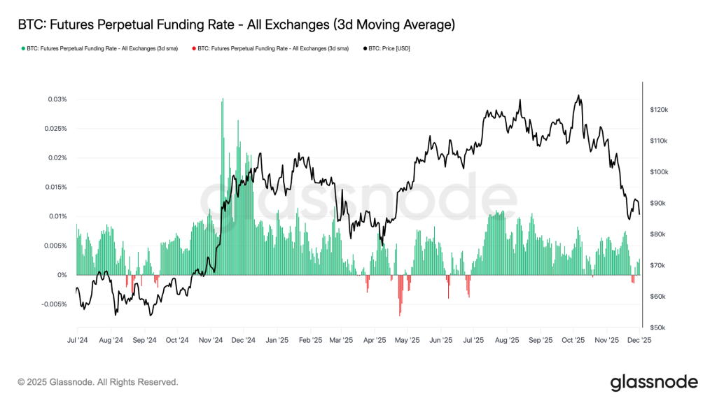 در کنار کاهش معاملات بازار اسپات، بازار فیوچرز نیز غیرفعال است و تمایل چندانی به استفاده از اهرم وجود ندارد. اوپن اینترست بازار فیوچرز همچنان پایین است و فاندینگ ریت تقریبا در سطح خنثی باقی مانده است. این شرایط نشان می‌دهد که اطمینان کافی در بازار مشتقه وجود ندارد و سرمایه‌گذاران محتاط هستند.