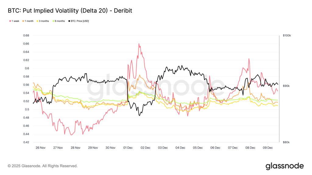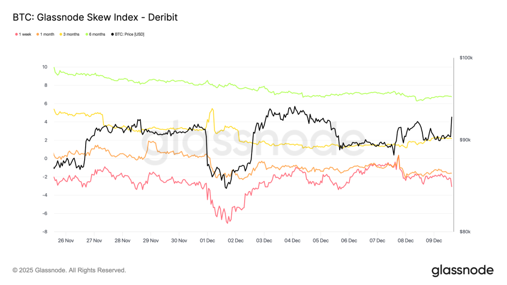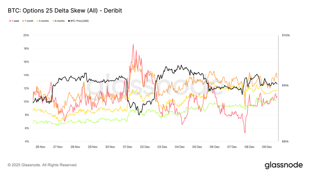 هم‌زمان با افزایش نوسانات ضمنی سررسیدهای کوتاه‌مدت، هزینه یا پریمیوم قراردادهای پوت نیز افزایش یافته است. شاخص انحراف ۲۵ دلتا (که هزینه قراردادهای پوت و کال را در یک دلتای معین مقایسه می‌کند) برای سررسیدهای یک‌هفته‌ای به حدود ۱۱ درصد افزایش یافته است. این موضوع نشان می‌دهد که در روزهای قبل از جلسه FOMC، تقاضا برای پوشش ریسک و بیمه کردن سرمایه در برابر نوسانات کوتاه‌مدت افزایش یافته است.