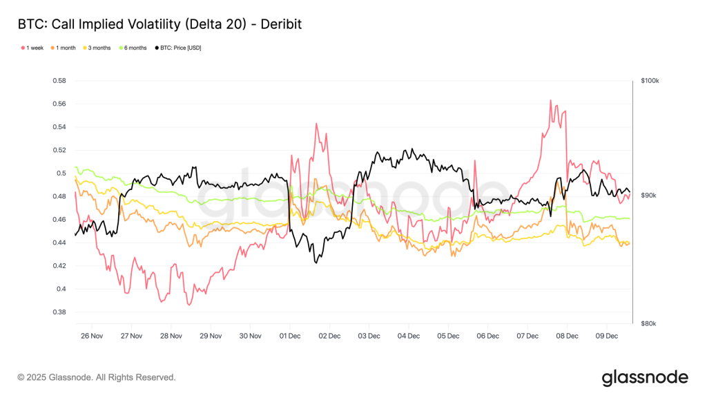 برای کال‌های ۲۰ دلتا، نوسانات سررسید یک‌هفته‌ای نسبت به هفته گذشته حدود ۱۰ واحد افزایش یافته است، اما نوسانات سررسیدهای بلندمدت تقریبا ثابت مانده‌ است. همین الگو برای پوت‌های ۲۰ دلتا نیز تکرار شده است؛ نوسانات ضمنی سررسید‌های کوتاه‌مدت نزولی افزایش یافته، اما نوسانات سررسیدهای بلندمدت بدون تغییر مانده‌ است.