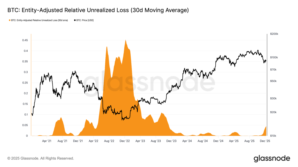 میانگین متحرک ۳۰روزه ضرر تحقق‌نیافته نسبی بیت کوین که در طول دو سال اخیر زیر ۲٪ بود، در حال حاضر به ۴.۴٪ افزایش یافته است. این موضوع نشانه‌ تغییر وضعیت بازار از فاز سرخوشی به فاز استرس و نااطمینانی است. برای عبور از این فاز حساس، بیت کوین به موج تازه نقدینگی و تقاضا نیاز دارد تا اعتماد سرمایه‌گذاران دوباره به بازار جذب شود.