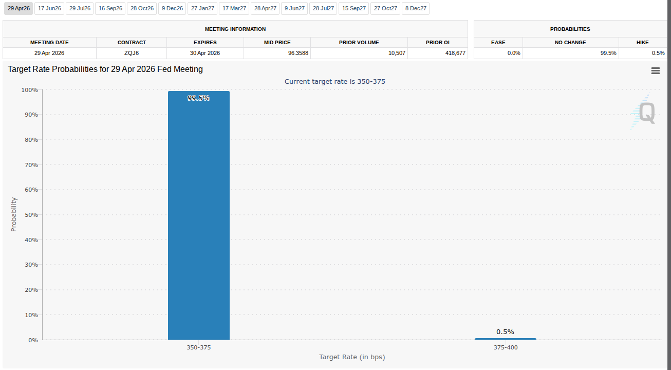 آخرین دادههای ابزار «FedWatch» گروه CME نشان میدهد که شانس تغییر نرخ بهره توسط فدرال رزرو در نشست هفته آینده عملاً صفر است.