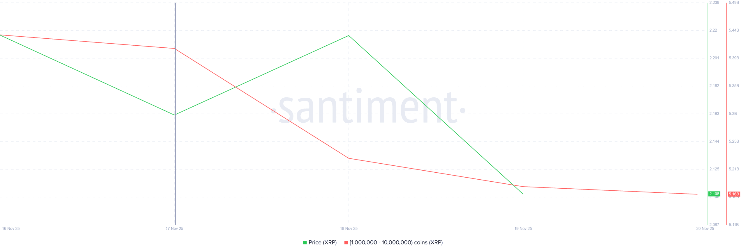 فعالیت نهنگها واضحترین توضیح را برای این ضعف ارائه میدهد. هولدرهای بزرگ در طول هفته قبل به فروش ادامه داده و فشار نزولی XRP را تقویت کردهاند. تنها در ۴۸ ساعت گذشته، کیف پولهایی که بین ۱ میلیون تا ۱۰ میلیون XRP نگهداری میکردند، بیش از ۲۵۰ میلیون توکن به ارزش بیش از ۵۲۸ میلیون دلار فروختهاند.