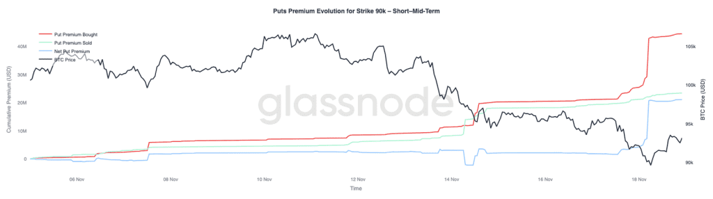 اگر جریان قراردادهای پوت با قیمت اعمال ۹۰,۰۰۰ دلار را بررسی کنیم، متوجه میشویم که با کاهش قیمت بیت کوین، تقاضا برای پوشش ریسک در بازار آپشن شدت گرفته است. طی دو هفته اخیر، پریمیوم قراردادهای پوت با قیمت اعمال ۹۰,۰۰۰ دلار تقریبا ثابت و متعادل بود. اما وقتی که حمایت ۹۳,۰۰۰ دلار شکسته شد، تقاضا برای این قراردادها بیشتر شد و پریمیوم قراردادهای پوت ۹۰,۰۰۰ دلار بهطور چشمگیری افزایش یافت.