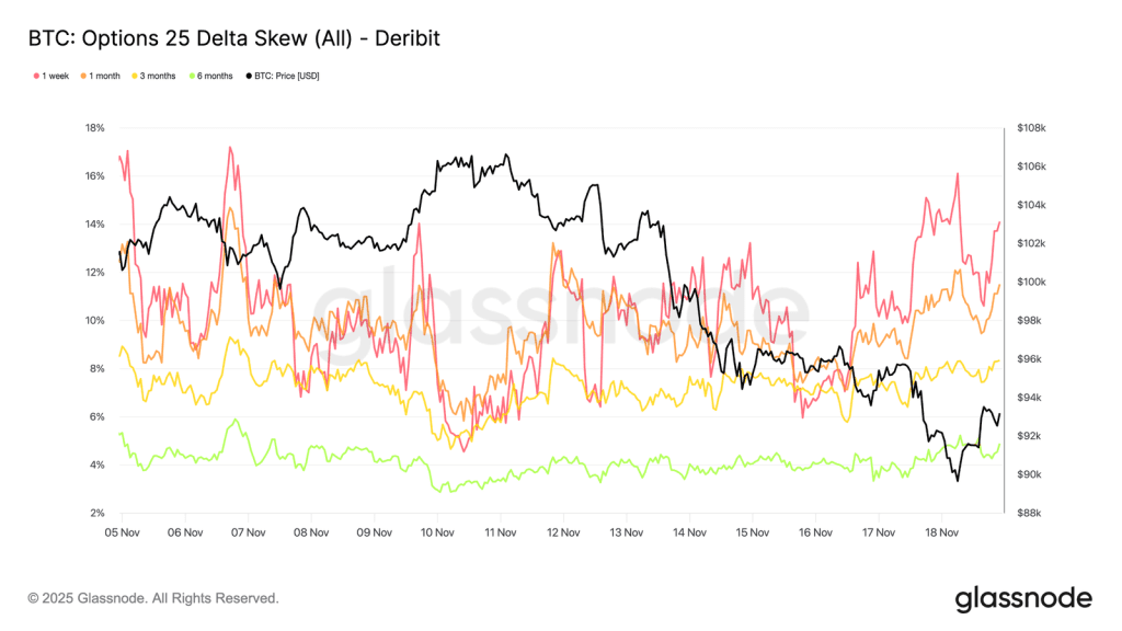 بازار آپشن معمولا اولین بازاری است که ریسک و رویدادهای منفی را قیمتگذاری یا بهاصطلاح پرایس میکند؛ یعنی اثرات ریسک، قبل از سایر بازارهای (اسپات و فیوچرز) در بازار آپشن ظاهر میشود. به محض اینکه قیمت بیت کوین به زیر ۹۰,۰۰۰ دلار رسید، نوسانات ضمنی (IV) تمام سررسیدهای آپشن (بهخصوص سررسیدهای کوتاهمدت) بهشدت افزایش یافت.