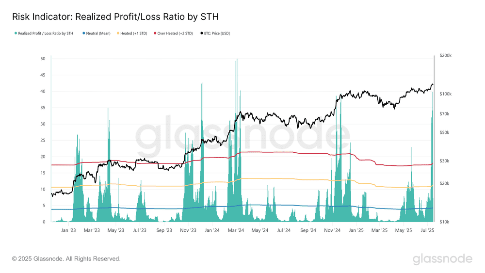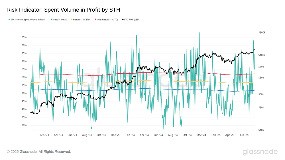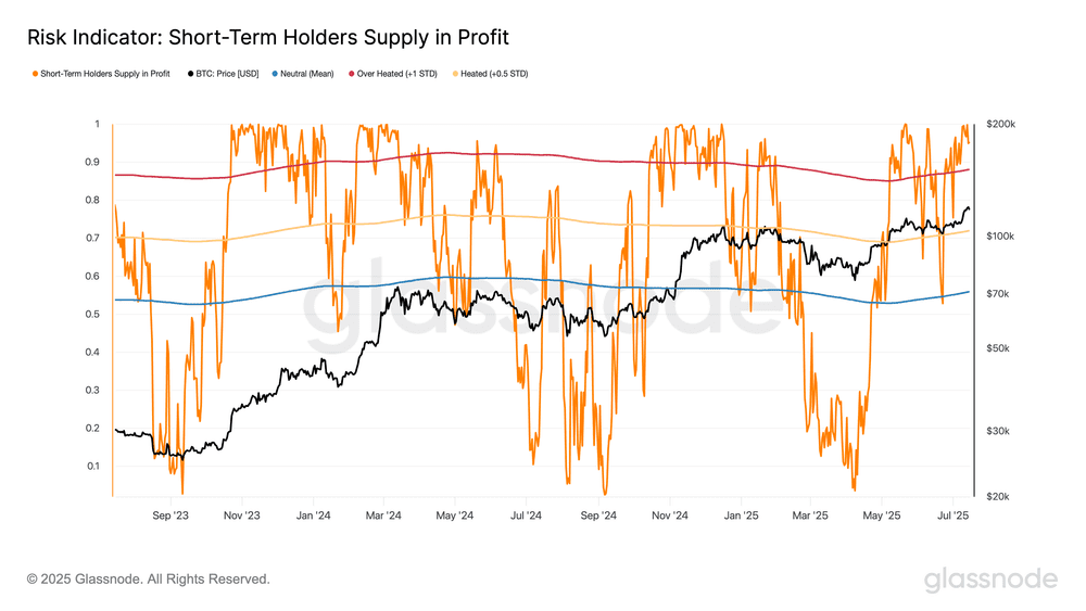 به گزارش گلسنود، یکی از این شاخصها، درصد عرضه در سود هولدرهای کوتاهمدت (Percent of Short-Term Holder Supply in Profit) است. در حال حاضر این شاخص به ۹۵٪ رسیده و بیش از ۱ انحراف معیار بالاتر از میانگین بلندمدت این شاخص (۸۸٪) قرار گرفته است. این نشان میدهد که سود تحققنیافته سرمایهگذاران جدید بهطور قابل توجهی افزایش یافته است.